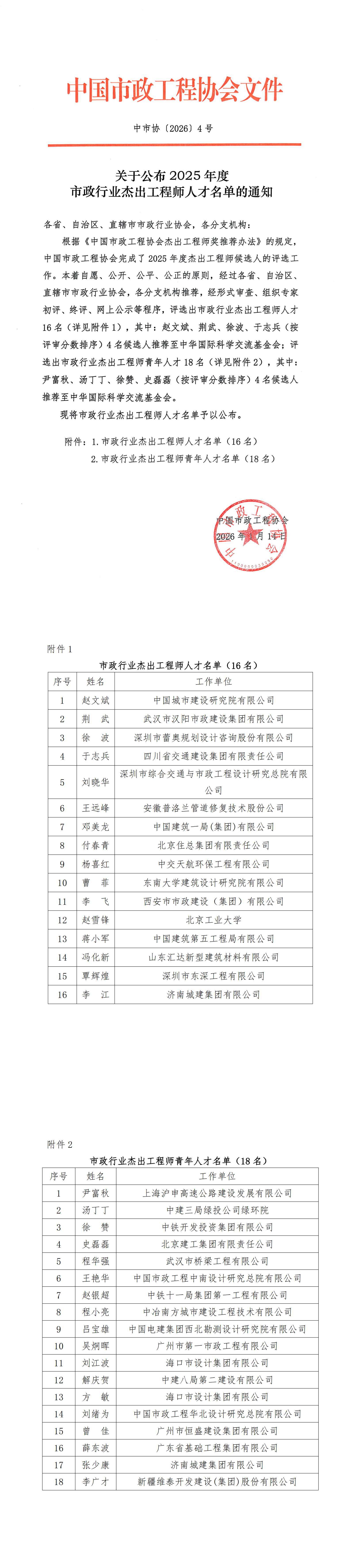 关于公布2025年度市政行业杰出工程师人才名单的通知