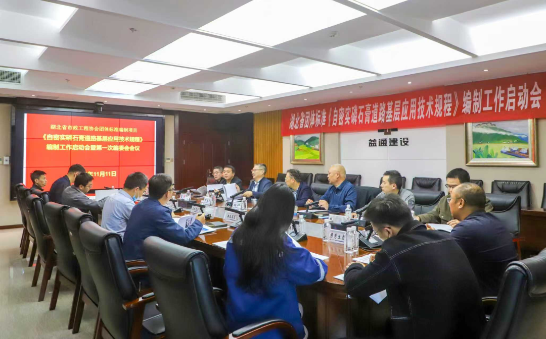 2025年11月11日,湖北省市政工程协会团体标准《自密实磷石膏道路基层应用技术规程》编制启动会暨第一次工作会议在湖北益通建设股份有限公司召开。湖北益通、汉江城建、湖北先创、武汉生态环境设计院、三峡大学、宜昌城发建工等16家参编单位的代表及编制组成员共计20余人齐聚一堂,共同讨论标准编制工作大纲和草案,为推动磷石膏大规模资源化利用奠定基础。