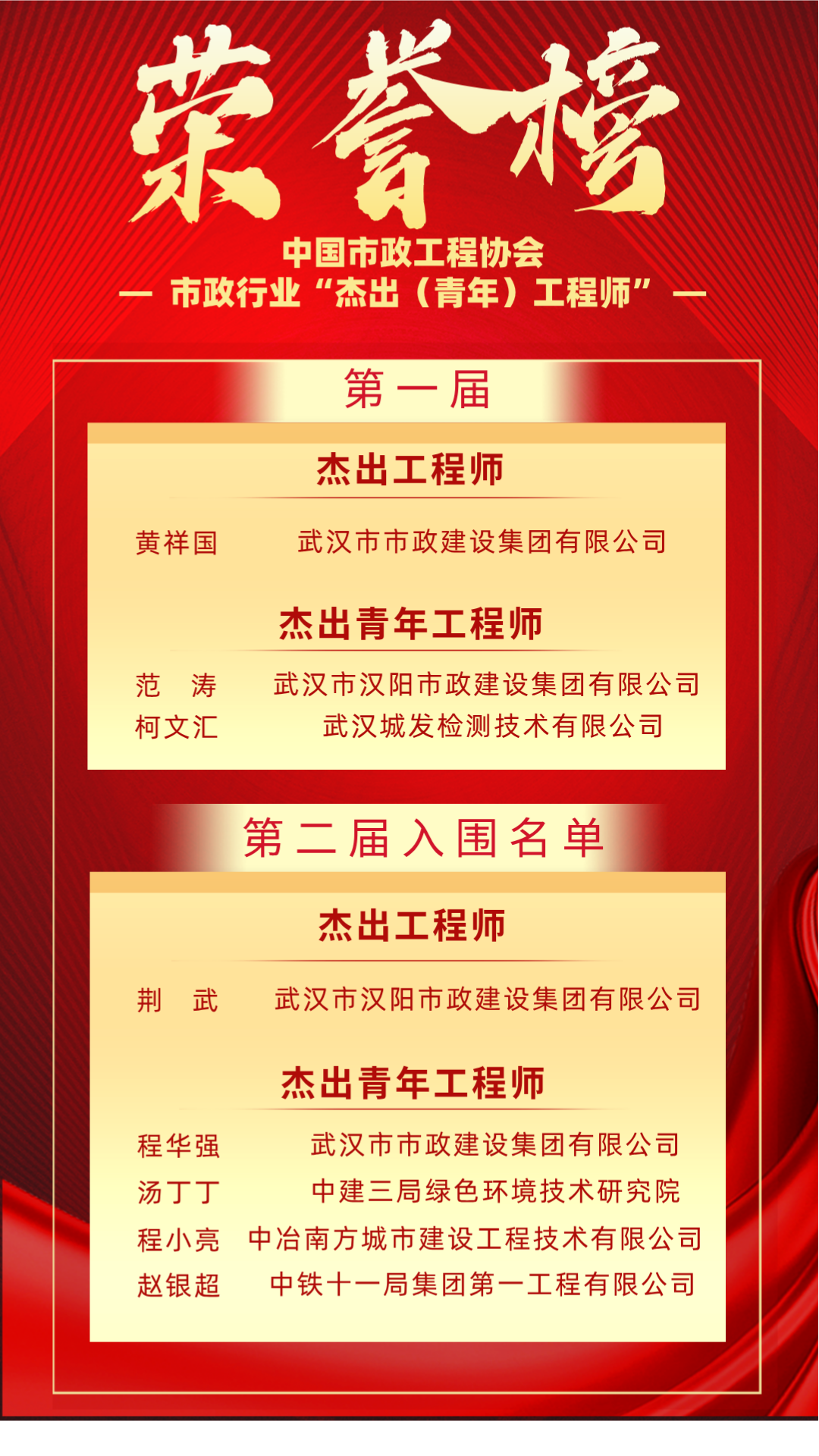 值得关注的是,今年由协会推荐的武汉市汉阳市政建设集团有限公司荆武(杰出工程师),武汉市市政建设集团有限公司程华强、中建三局绿色环境技术研究院汤丁丁、中冶南方城市建设工程技术有限公司程小亮、中铁十一局集团第一工程有限公司赵银超(杰出青年工程师)等5名工程师已成功入围第二届杰出工程师、杰出青年工程师答辩环节。