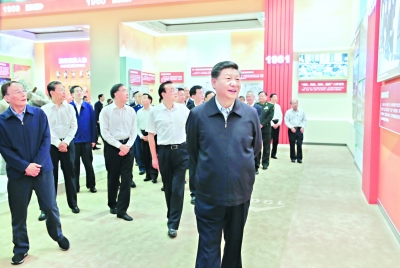 下午4时10分许,习近平等党和国家领导同志来到北京展览馆,步入展厅参观展览。展览以开辟和发展中国特色社会主义道路、建设社会主义现代化国家为主题,以编年体为时间主线,安排设计了5个部分,并体现历次党代会和重要中央全会、五年规划(计划)等方面的跨段主线,选择150个“新中国第一”进行展示,每10年设置英雄模范人物墙,充分运用声光电等多媒体科技展示手段,全方位立体化呈现新中国成立70年来中国共产党领导中国人民发愤图强、艰苦奋斗实现的伟大跨越,清晰展现党的领导和我国社会主义制度集中力量办大事的政治优势,深刻揭示新中国70年巨变背后的深刻道理。
