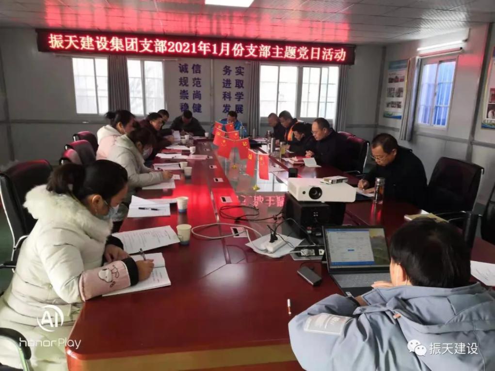 1月4日上午,振天建设集团党支部在浠水县北城新区窑湖公园、月西公园建设项目EPC总承包项目部会议室举行2021年1月份支部主题党日活动。学习活动由支部书记、董事长马运峰同志主持,共有16名党员、入党积极分子参加。