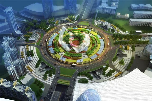 “一元”,指整体上采用同心圆造型,与直径200米的圆形广场契合。