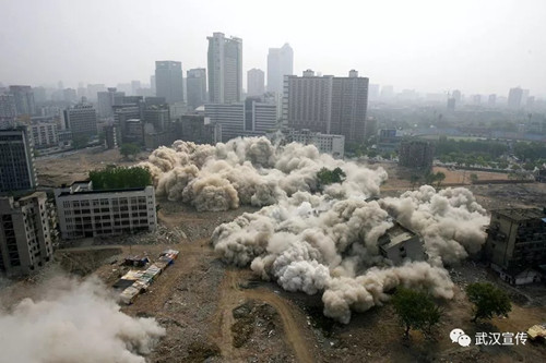 城市规划建设背后,是健康有序的新陈代谢——只有破旧,才能立新。2017年1月21日晚11时50分许,随着一声令下,汉口滨江国际商务区内的19栋楼房在隆隆爆破声中顺次倒下,全过程共历时约10秒。这是目前国内外最大的建筑群楼爆破,现场共钻炮口12万余个,使用炸药5吨,倒塌时间精确到毫秒,解决了群楼爆破定向倒塌的问题。