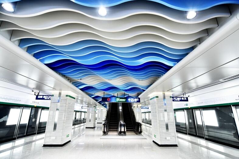 瓦蓝的天空中絮状白云好似随风游走,绵延百米的老骑楼诉说着武汉故事,汉白玉雕刻而成的市井百态壁画展现商贾云集的盛景,一张张整齐摆放的竹床勾起老武汉心中的盛夏之夜……再熟悉不过的汉正街被武汉地铁的设计者和建设者们搬进了地铁站,通过创新空间设计,创造了全国首次侧跨楼板全部打开的先例,完美实现了“在室内再现室外实景”的艺术效果。气势恢宏、原汁原味的汉正街站也因此惊艳一时,成为往来于此的乘客驻足观赏的景点。