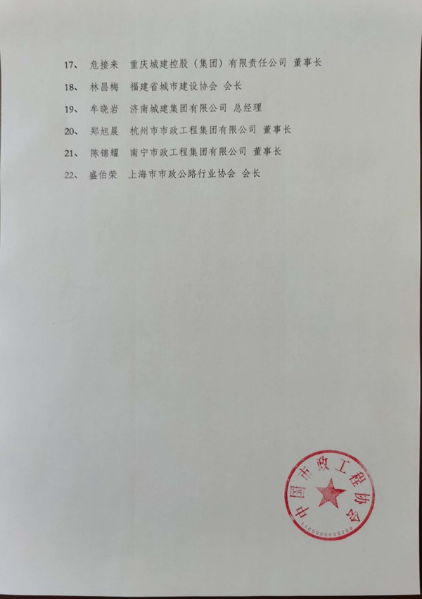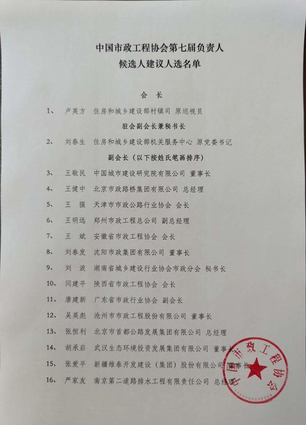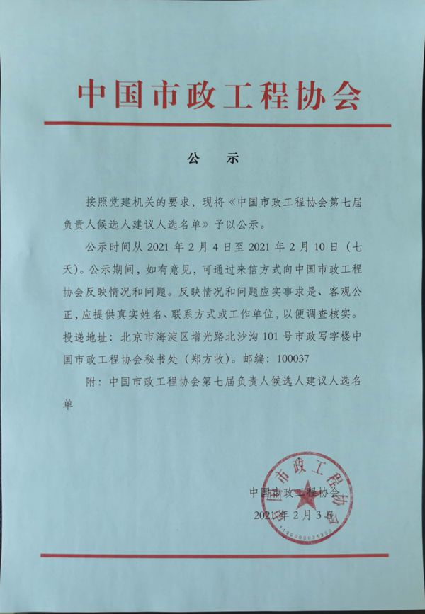 中国市政工程协会第七届负责人候选人建议人选名单公示