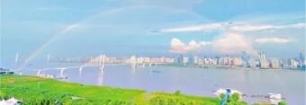 19日下午,一场强降雨后,城市上空出现了一道绚丽的彩虹。