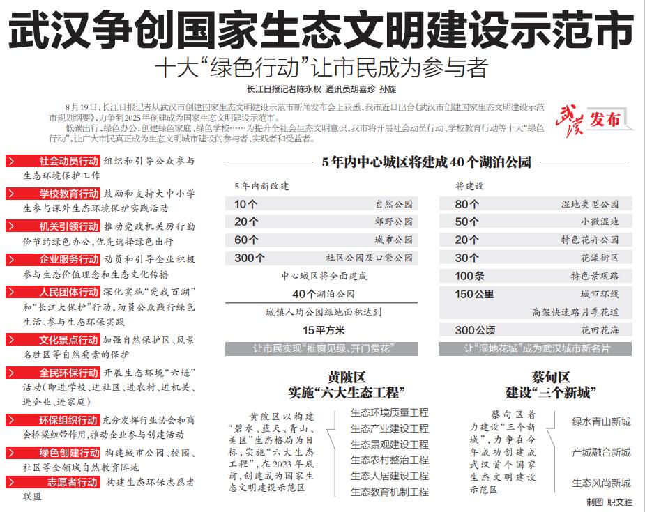 8月19日,长江日报记者从武汉市创建国家生态文明建设示范市新闻发布会上获悉,我市近日出台《武汉市创建国家生态文明建设示范市规划纲要》,力争到2025年创建成为国家生态文明建设示范市。
