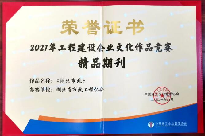 随后,会上公布了2021年工程建设企业文化作品竞赛结果,湖北省市政工程协会会刊《湖北市政》荣获“精品期刊”荣誉,这是《湖北市政》连续三次获得此荣誉。
