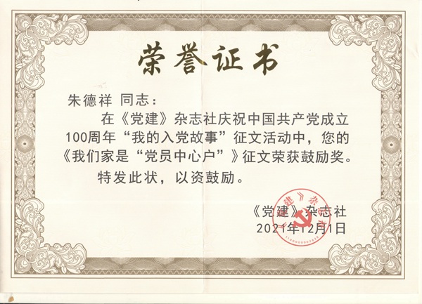 为热烈庆祝中国共产党成立100周年,引导和激励广大党员干部不忘初心、牢记使命、坚定信仰、砥砺前行,中央宣传部《党建》杂志社面向全国开展“我的入党故事”征文活动,3月开始至9月30日征文截止。协会党支部党员朱德祥撰写的《我们家是“党员中心户”》一文,在征文活动中荣获鼓励奖,同时党建网微信公众号推出了该文。