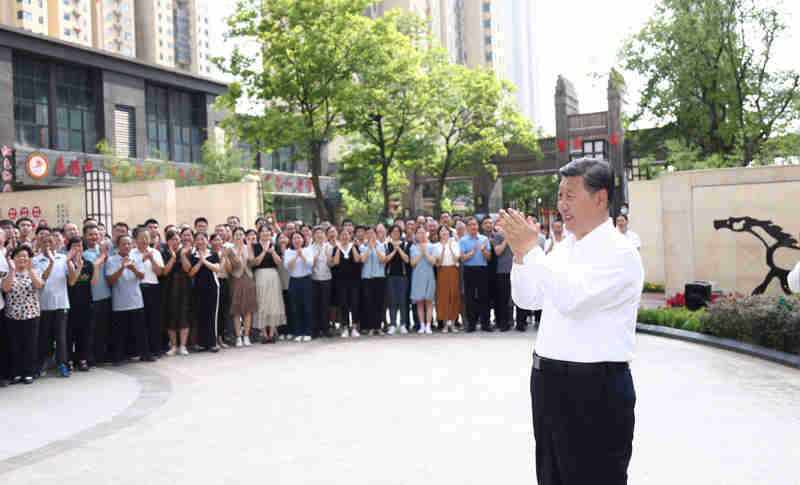 6月28日,中共中央总书记、国家主席、中央军委主席习近平在湖北省武汉市考察。这是28日下午,习近平在东湖高新区左岭街道智苑社区广场同干部群众亲切交流。(新华社发)