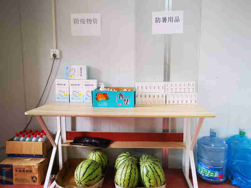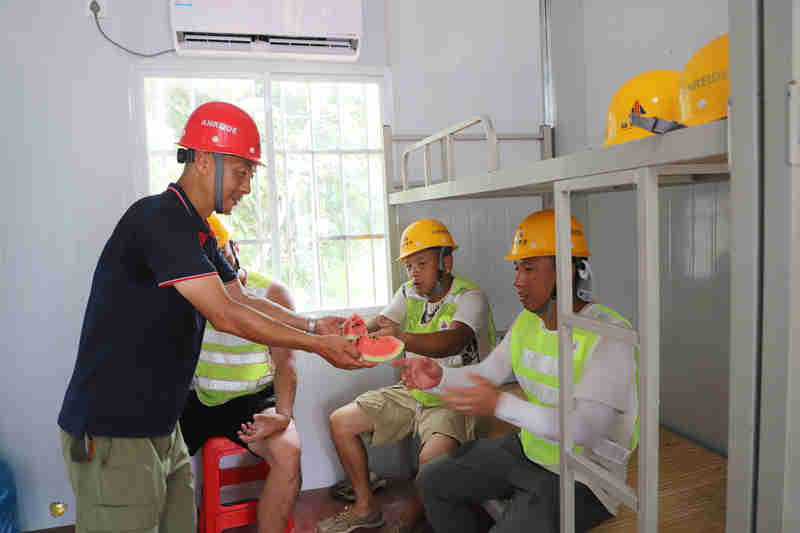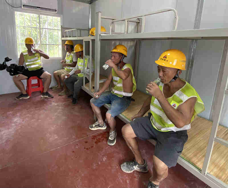 7月15日上午10点,空调休息房里迎来了第一批益通建设者。迎面而来的凉爽,让工人师傅们疲惫的身体瞬间回血。空调休息房里,有凉茶、藿香正气液、花露水,高低床上还铺好了凉席,最受师傅们欢迎的还要数冰镇西瓜和金银花露。