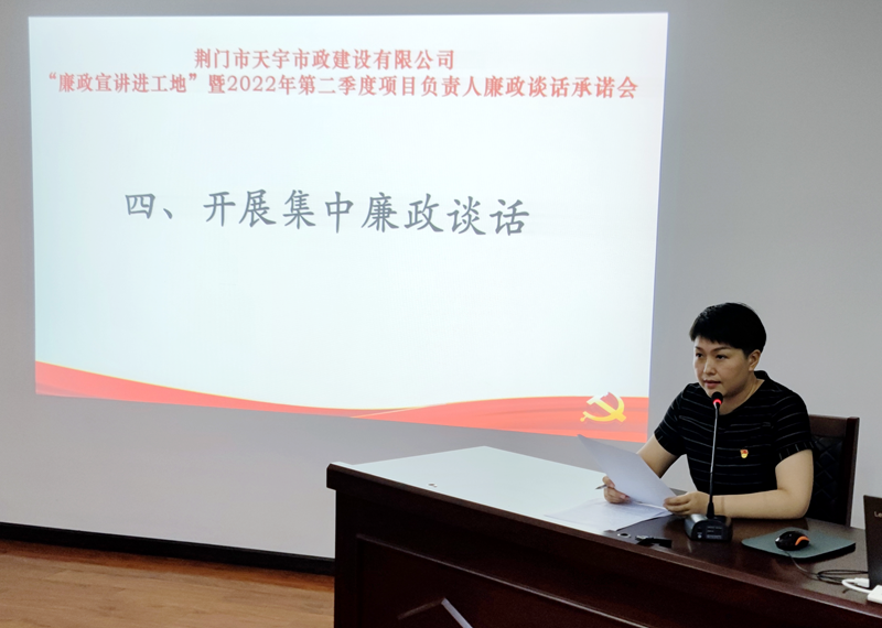 7月19日下午,荆门市天宇市政建设有限公司在月亮湖北路EPC项目部会议室组织召开了“廉政宣讲进工地”暨2022年第二季度项目管理人员集中廉政谈话承诺会议。公司领导班子、工程分公司、设备分公司、材料分公司中层干部、职工代表及月亮湖北路项目部全体工作人员参会。